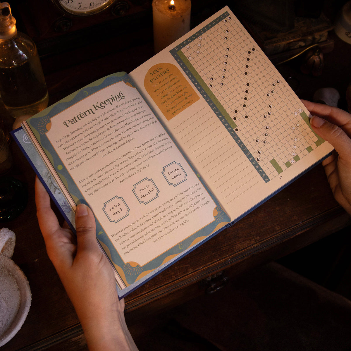 Track any synchronicities between the moon's phases using the tracking box on each page to monitor menstrual cycles, energy levels or moods.