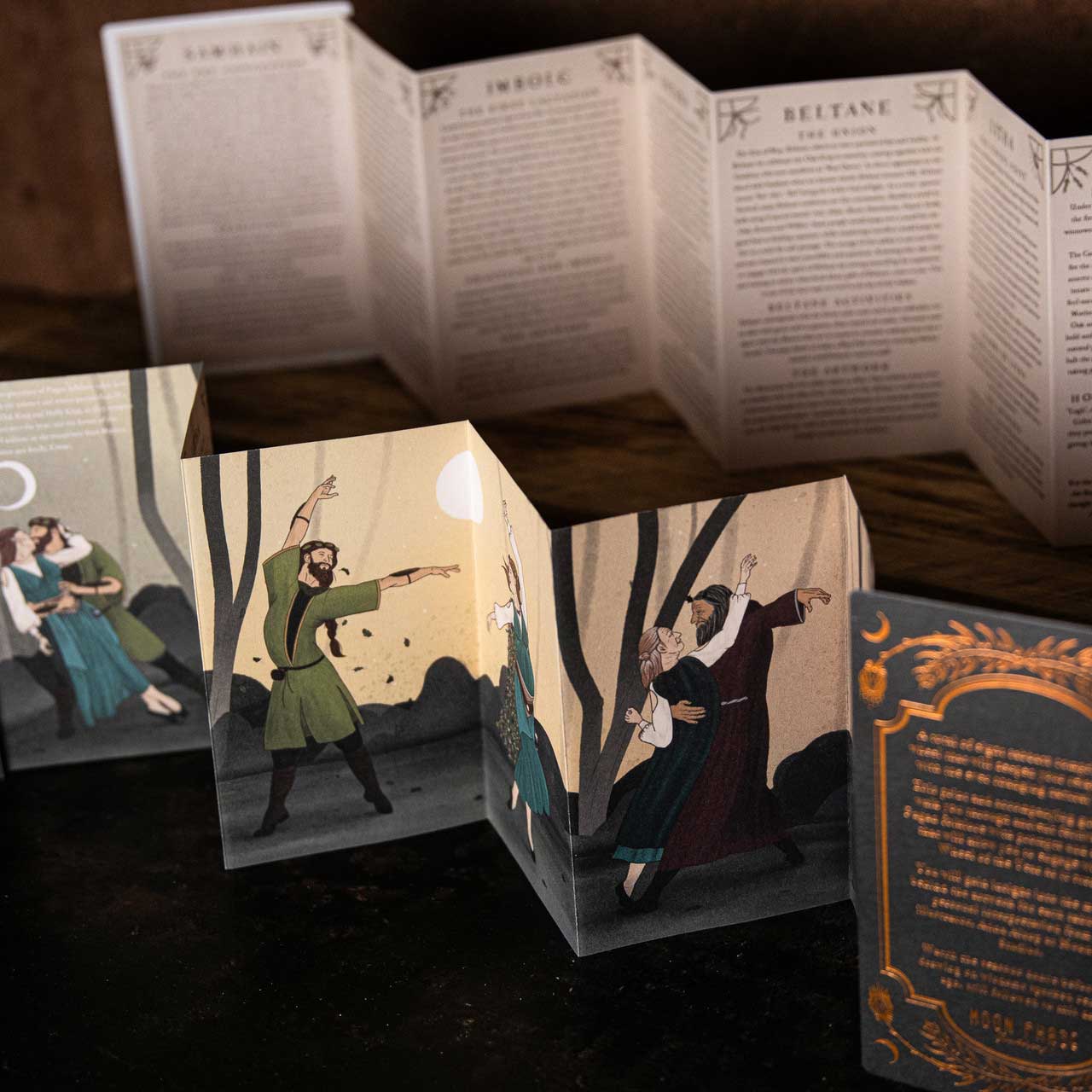 Also includes a separate illustrated concertina booklet decorated with copper foil. The contents elaborates on the artists inspiration for the artwork and meanings and ritual behind each Pagan feast. The reverse side has an illustration of the Holly King and the Oak King - a personification of summer and winter representing the changing seasons.